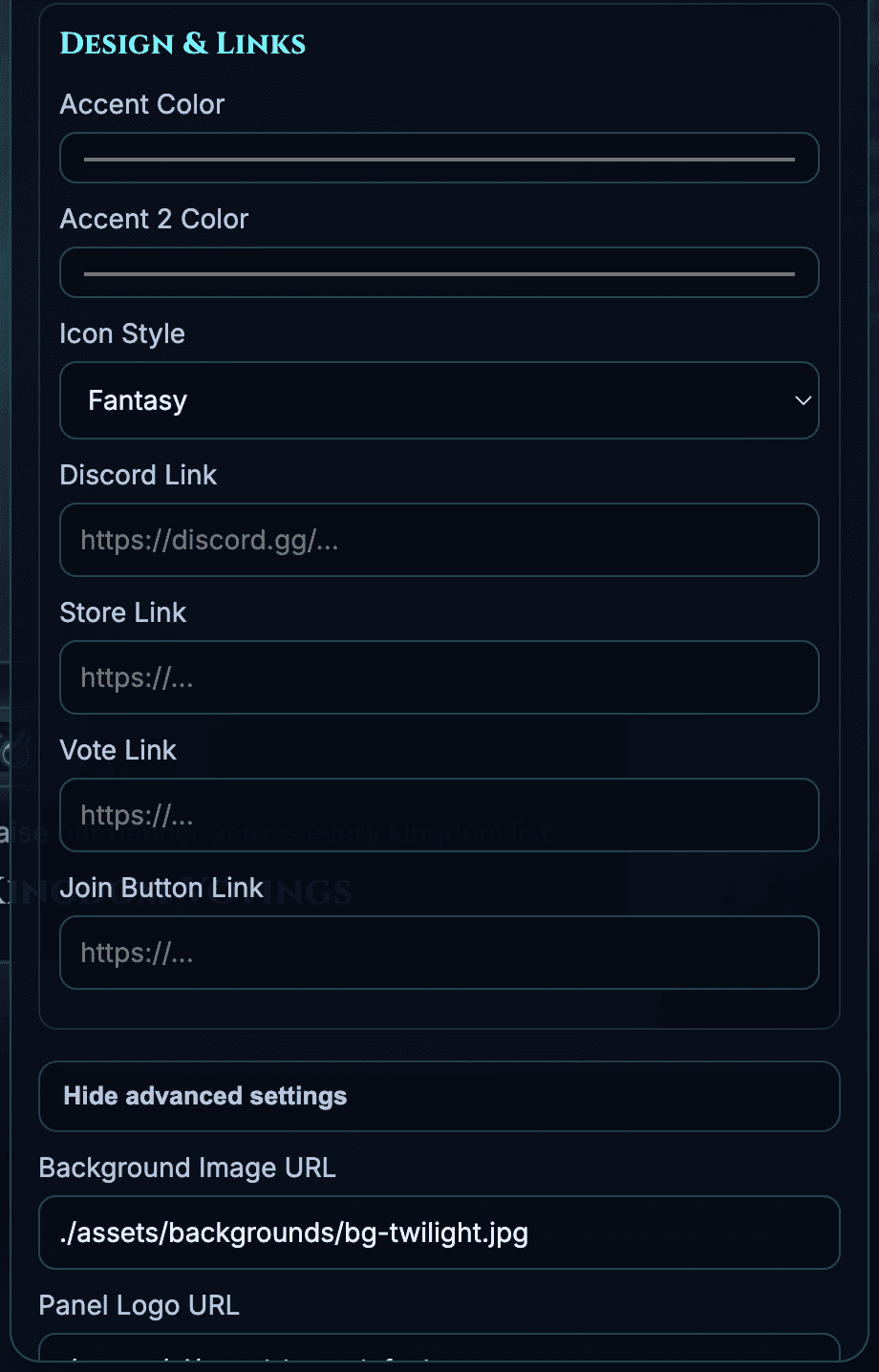 - Background (preset or custom URL)